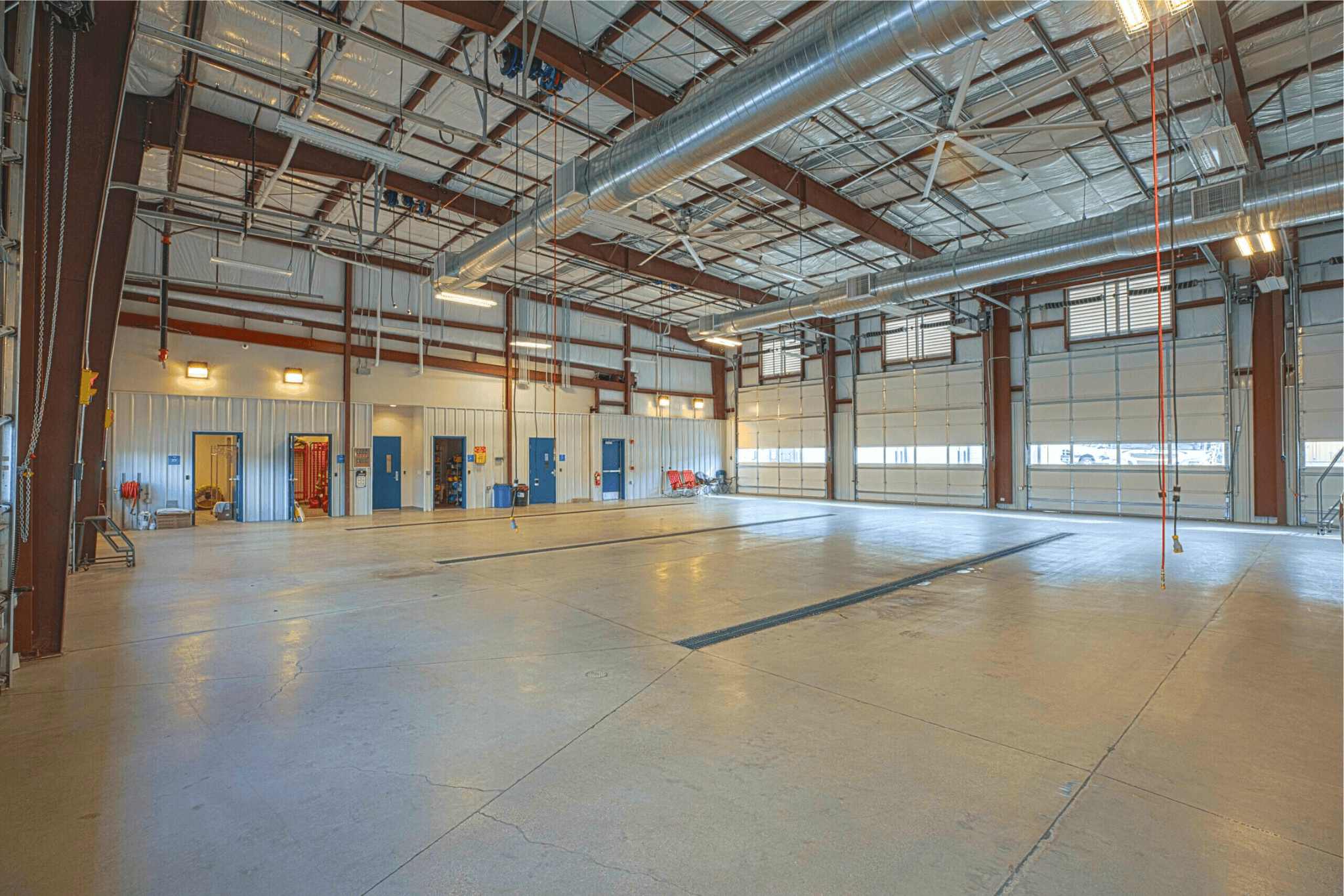 The new 10,000 SF fire station in Bullhead City features a state-of-the-art high-pressure ventilation system designed to enhance the removal of diesel exhaust carcinogens in the bays, preventing fumes from entering interior areas. This pre-engineered structure includes a 24-gauge trapezoidal rib standing seam roof system with R-32 long tab banded roof insulation for superior energy efficiency. The walls are sheeted with 24-gauge PBR panels and insulated with R-25. The building also includes three canopies with 26-gauge soffit panels, adding to its aesthetic appeal.