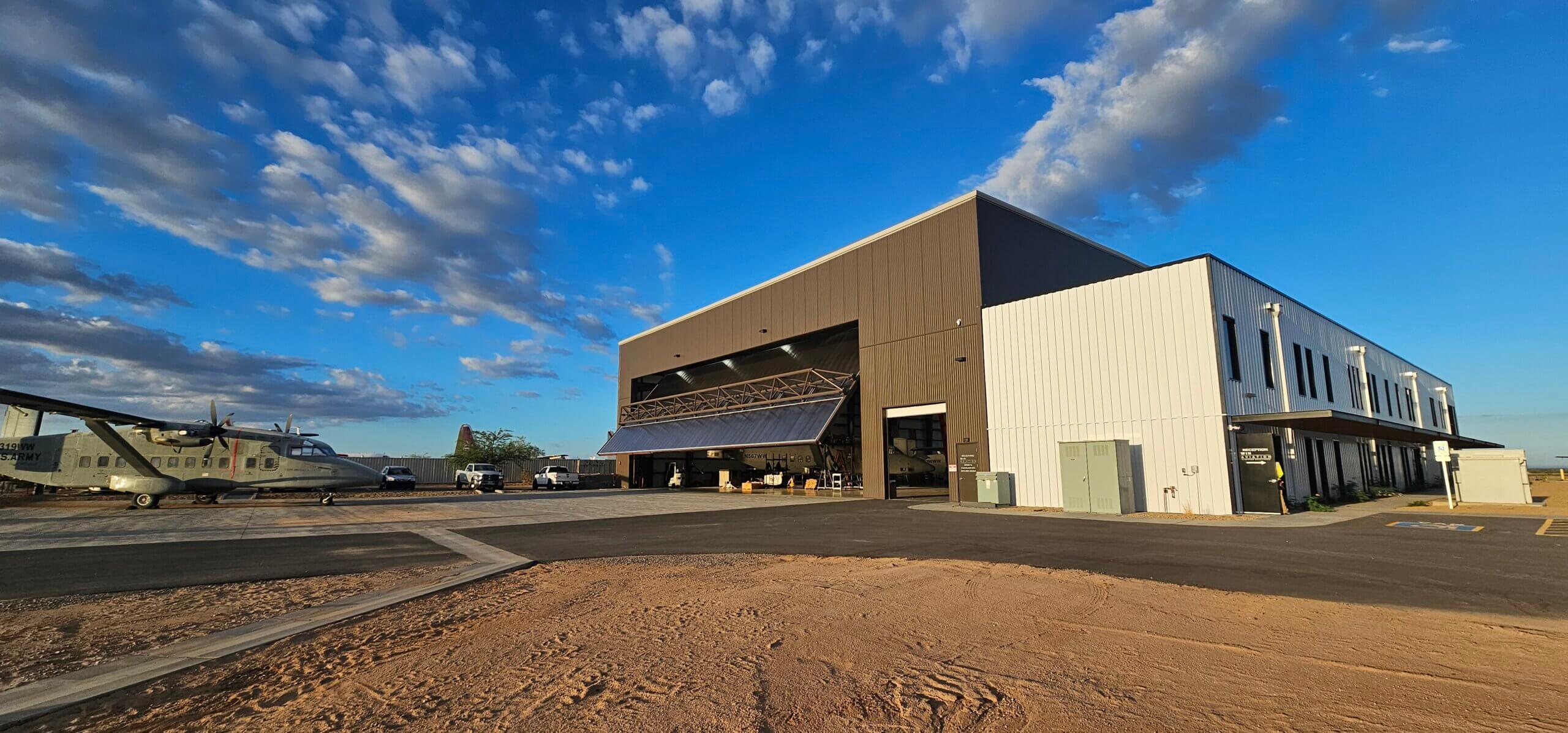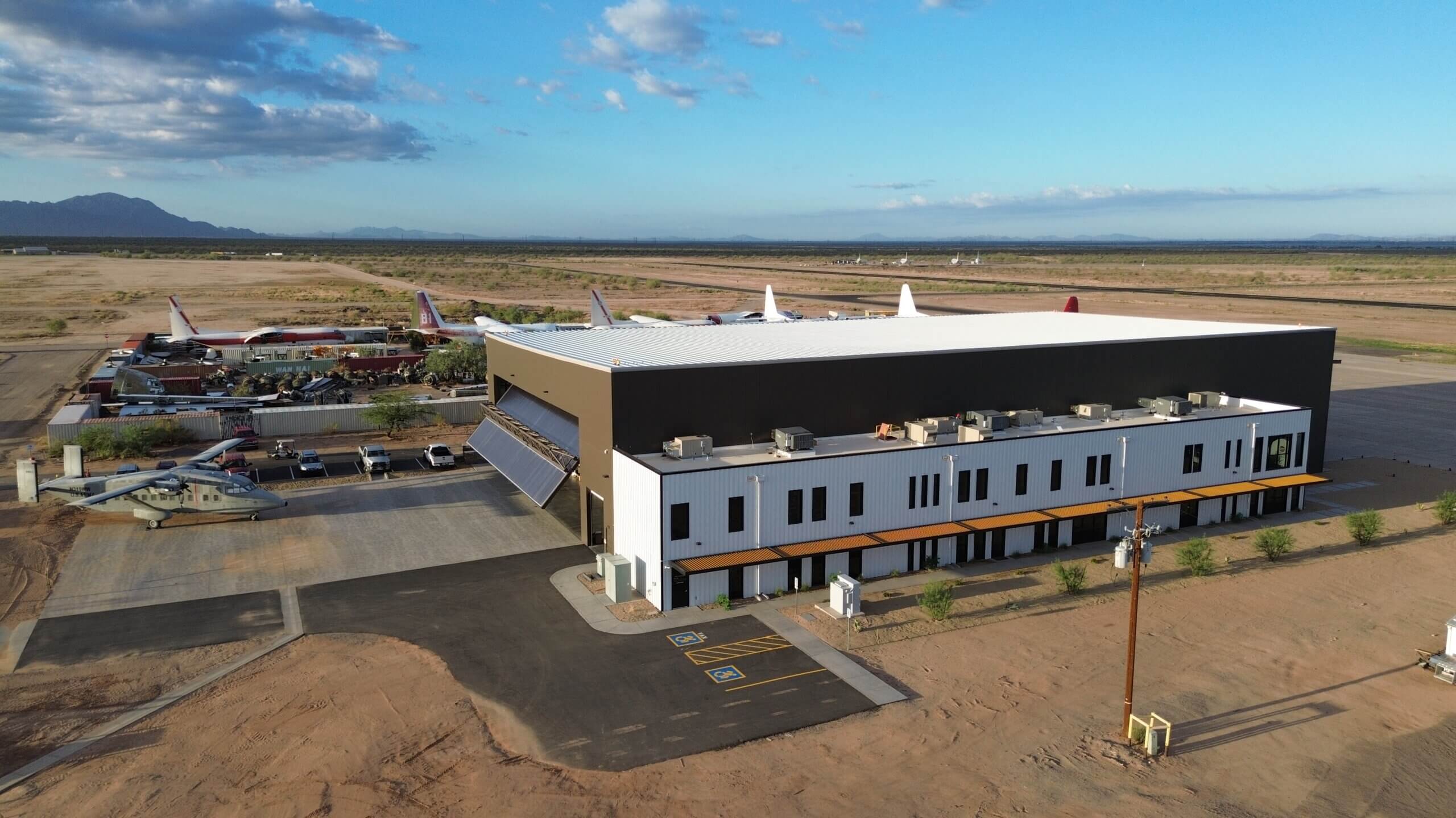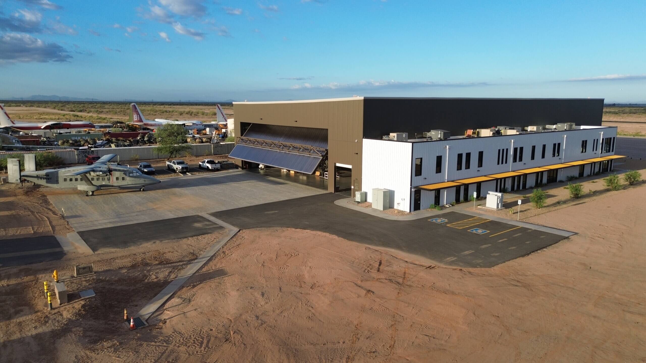 Image Building recently completed a state-of-the-art pre-engineered hangar and office complex in Coolidge, Arizona. The project features a 25,541-square-foot hangar and a 4,621-square-foot office lean-to, designed to meet the functional demands of modern aviation while delivering a clean, professional aesthetic. The hangar includes two high-performance hydraulic lift doors finished with Galina polycarbonate panels, ensuring efficient and durable aircraft access. The attached office space includes a full mezzanine and a 3′-9″ parapet wall, adding architectural dimension and usability. The exterior showcases 2.5″ thick, 26-gauge Double Mesa insulated metal panels in a dark bronze embossed finish, paired with 24-gauge TReveal panels in Regal White with matte black trim for a sleek, modern contrast. Pre-engineered systems were selected for their clear-span capabilities and long-term energy efficiency, with high R-value materials providing superior thermal performance and visual appeal.