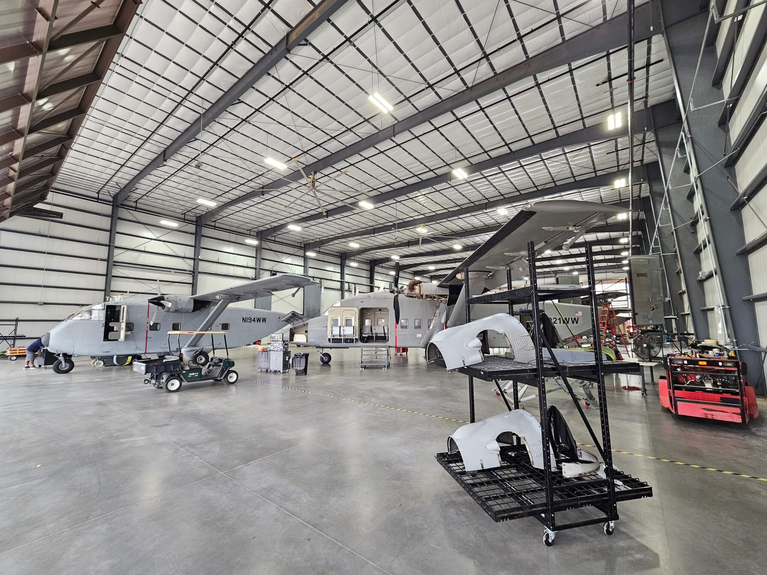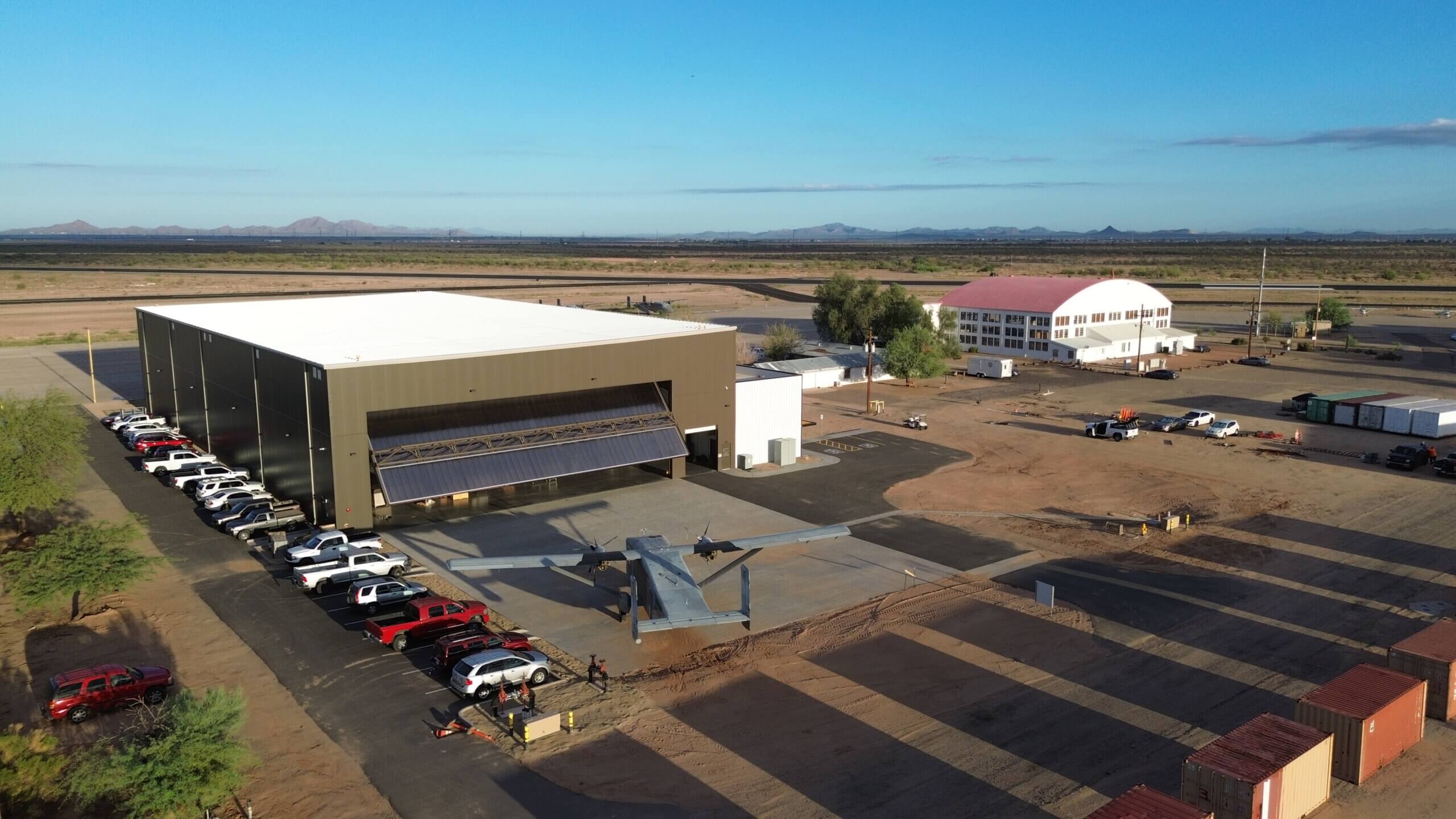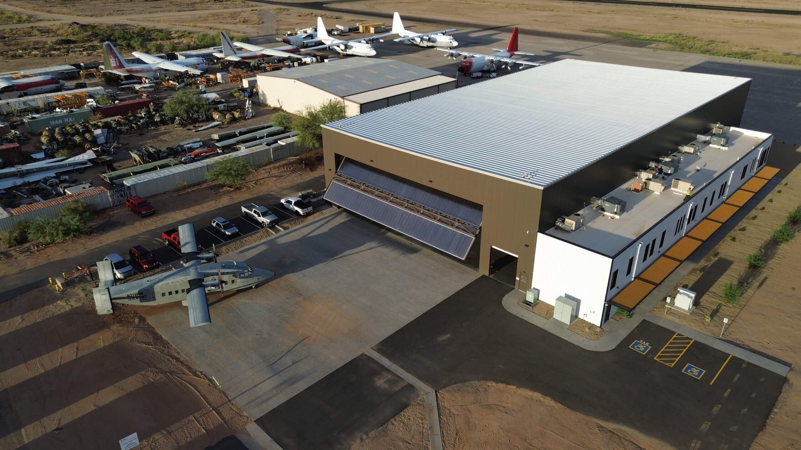 Image Building recently completed a state-of-the-art pre-engineered hangar and office complex in Coolidge, Arizona. The project features a 25,541-square-foot hangar and a 4,621-square-foot office lean-to, designed to meet the functional demands of modern aviation while delivering a clean, professional aesthetic. The hangar includes two high-performance hydraulic lift doors finished with Galina polycarbonate panels, ensuring efficient and durable aircraft access. The attached office space includes a full mezzanine and a 3′-9″ parapet wall, adding architectural dimension and usability. The exterior showcases 2.5″ thick, 26-gauge Double Mesa insulated metal panels in a dark bronze embossed finish, paired with 24-gauge TReveal panels in Regal White with matte black trim for a sleek, modern contrast. Pre-engineered systems were selected for their clear-span capabilities and long-term energy efficiency, with high R-value materials providing superior thermal performance and visual appeal.